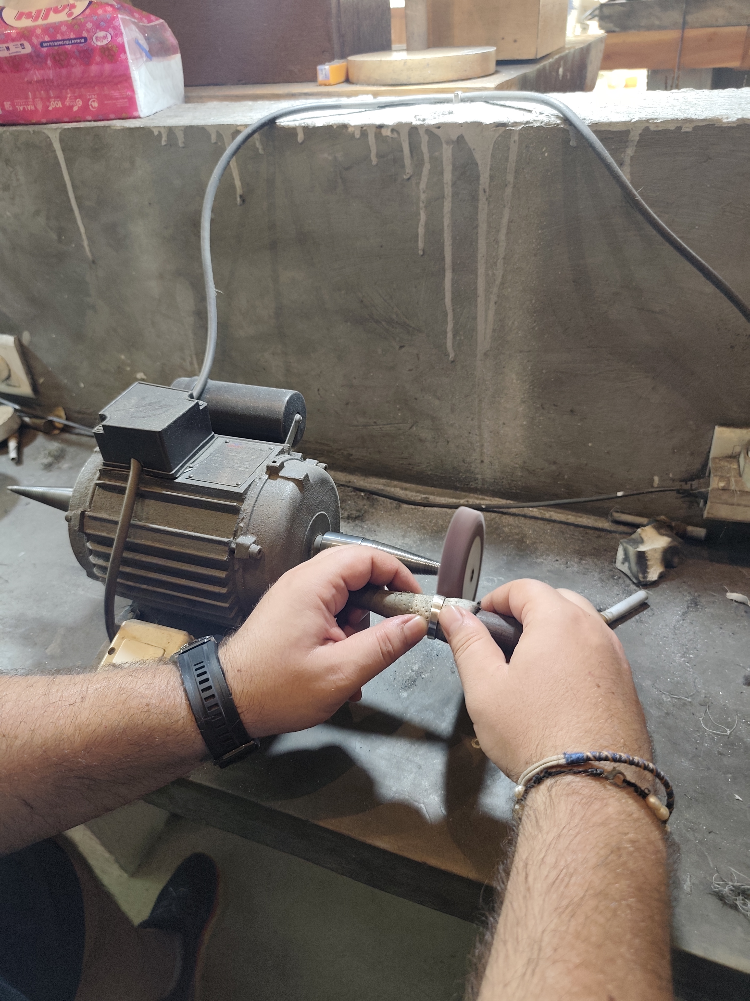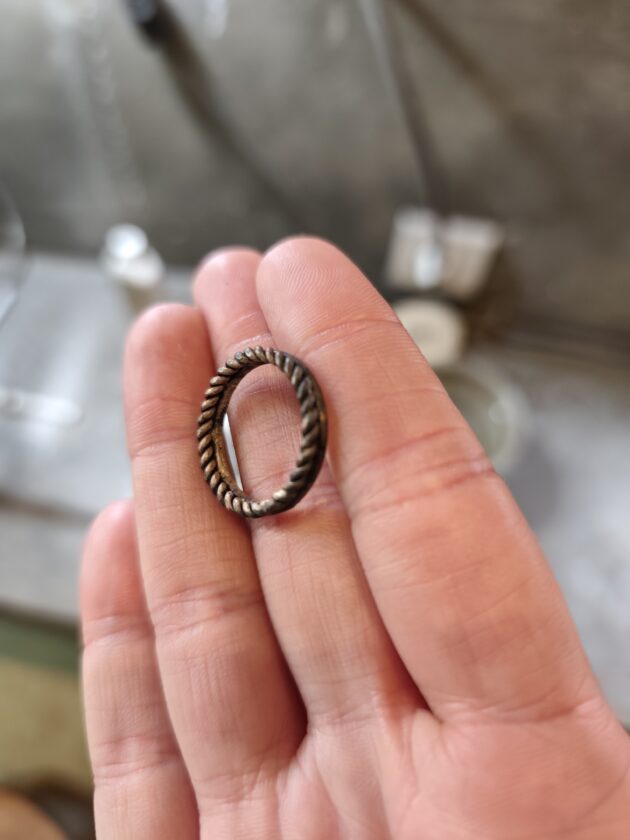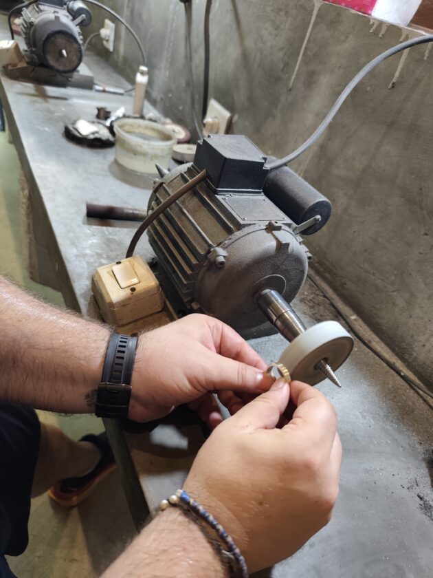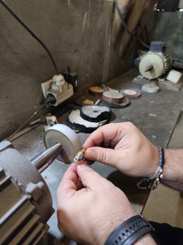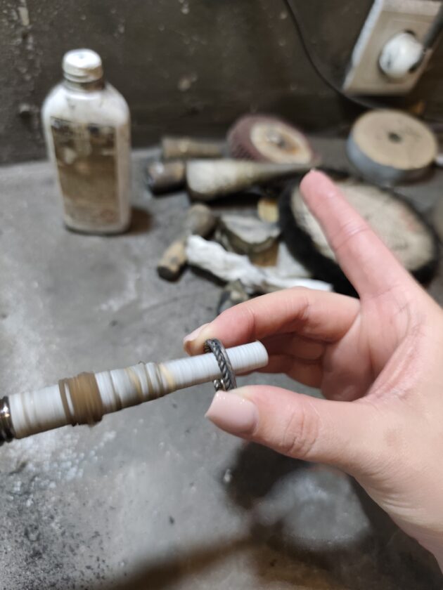 Au urmat operatiunea de pilire a zonei sudate, iar apoi ne-am mutat la polizor, unde am folosit benzi abrazive de diverse granulatii pentru a slefui inelul. La final, am utilizat o perie fina impreuna cu polish pentru argint, pentru a obtine aspectul final, dupa care am spalat pentru o ultima data inelul.