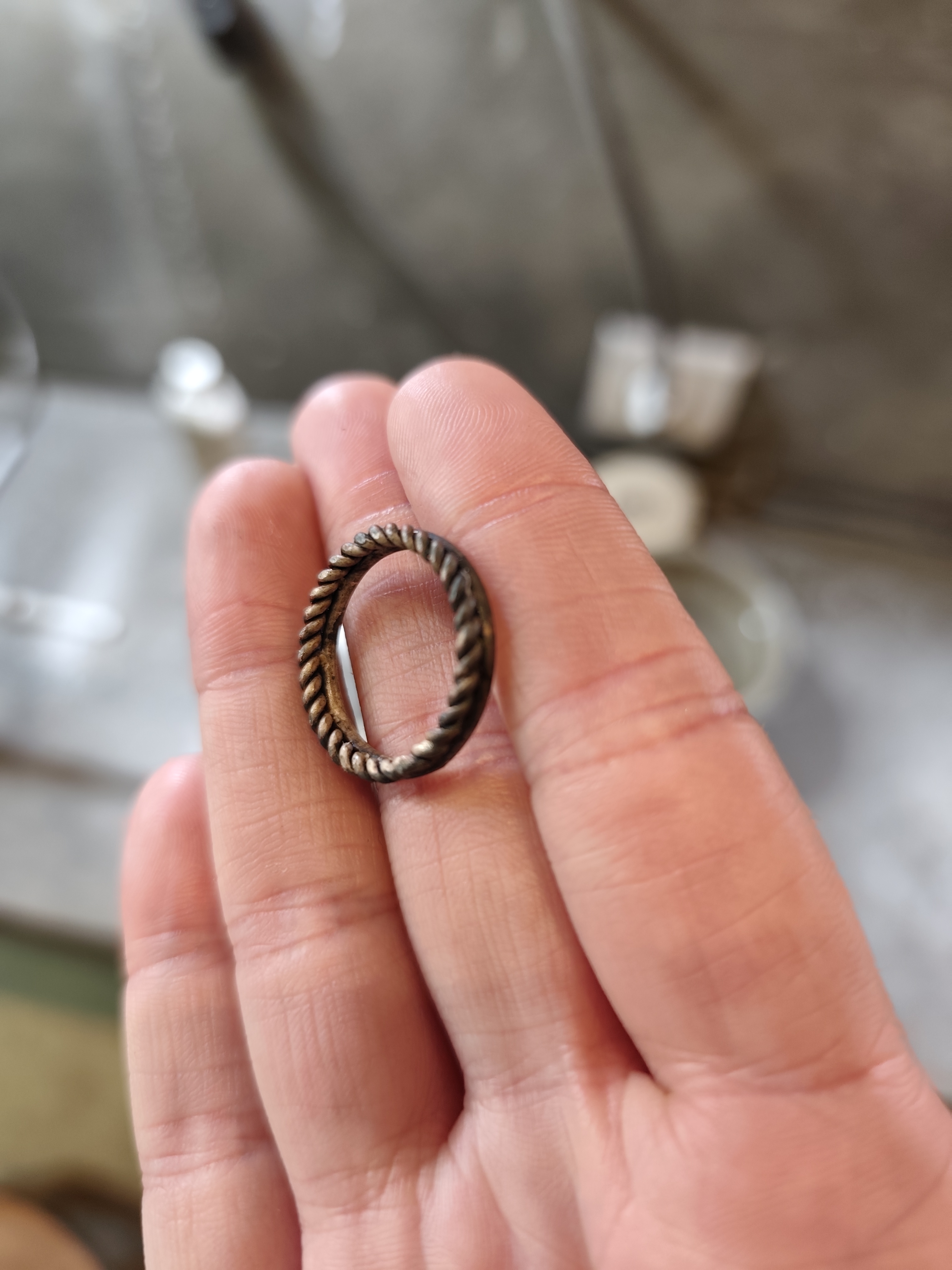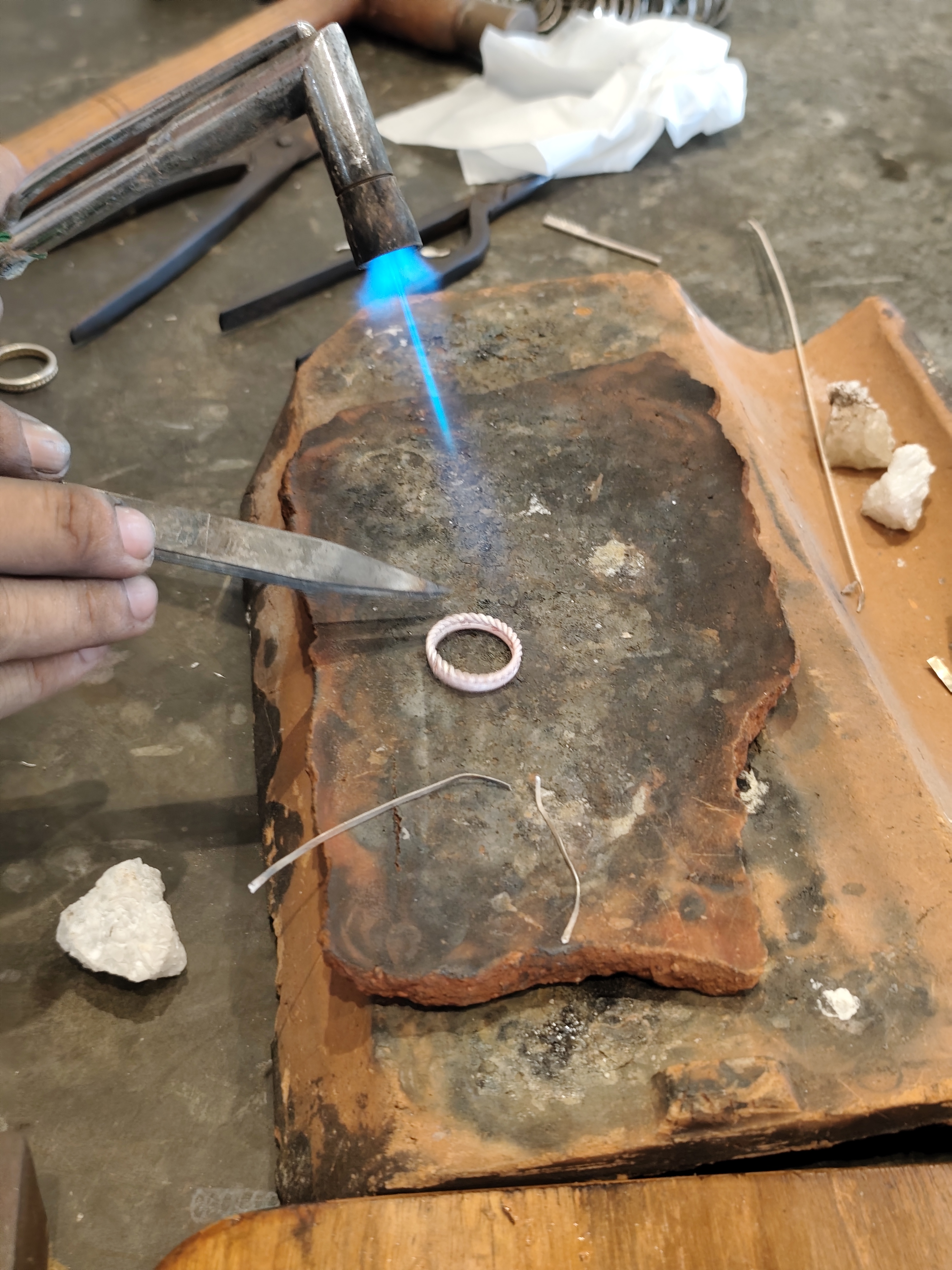 Dupa ce am oxidat gravura interioara si am spalat din nou inelul, a urmat transformarea benzii in cerc si lipirea capetelor cu ajutorul unor fire de argint pur, respectiv borax. Desigur, am primit ajutor considerabil din partea mesterului meu, acesta intervenind daca era cazul in cadrul operatiunilor mai migaloase.