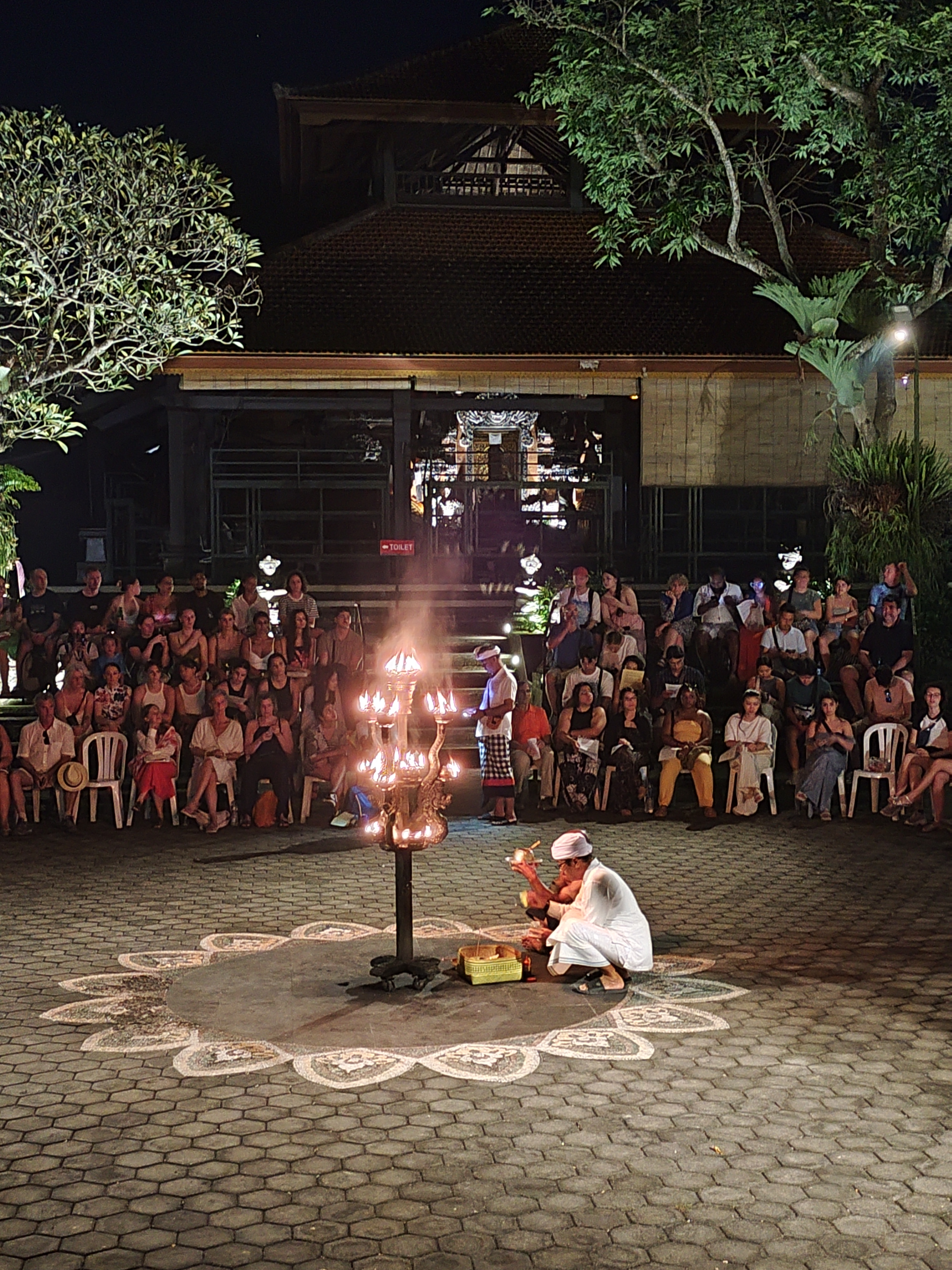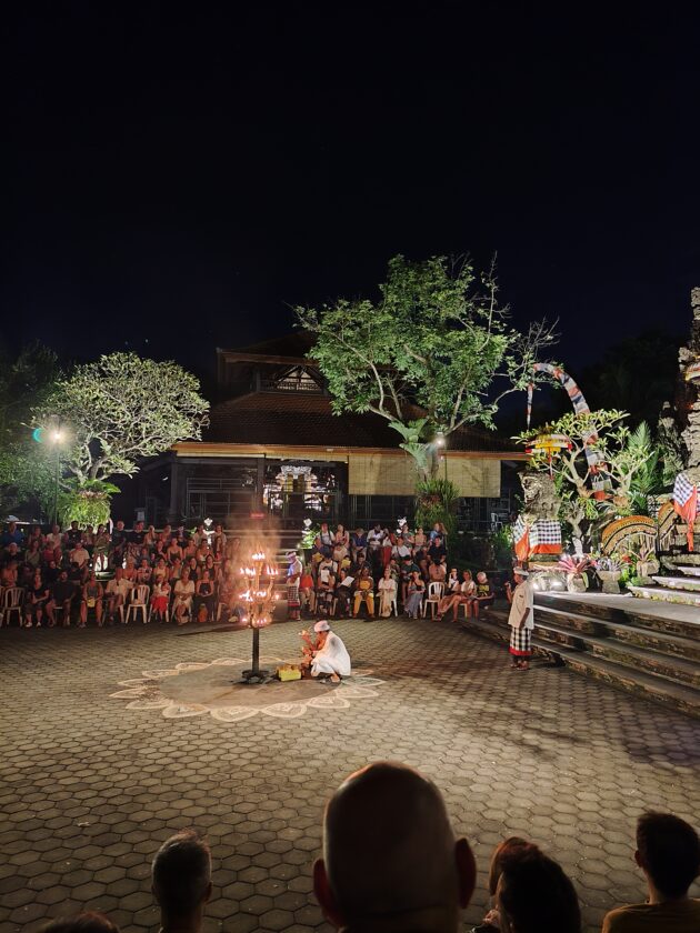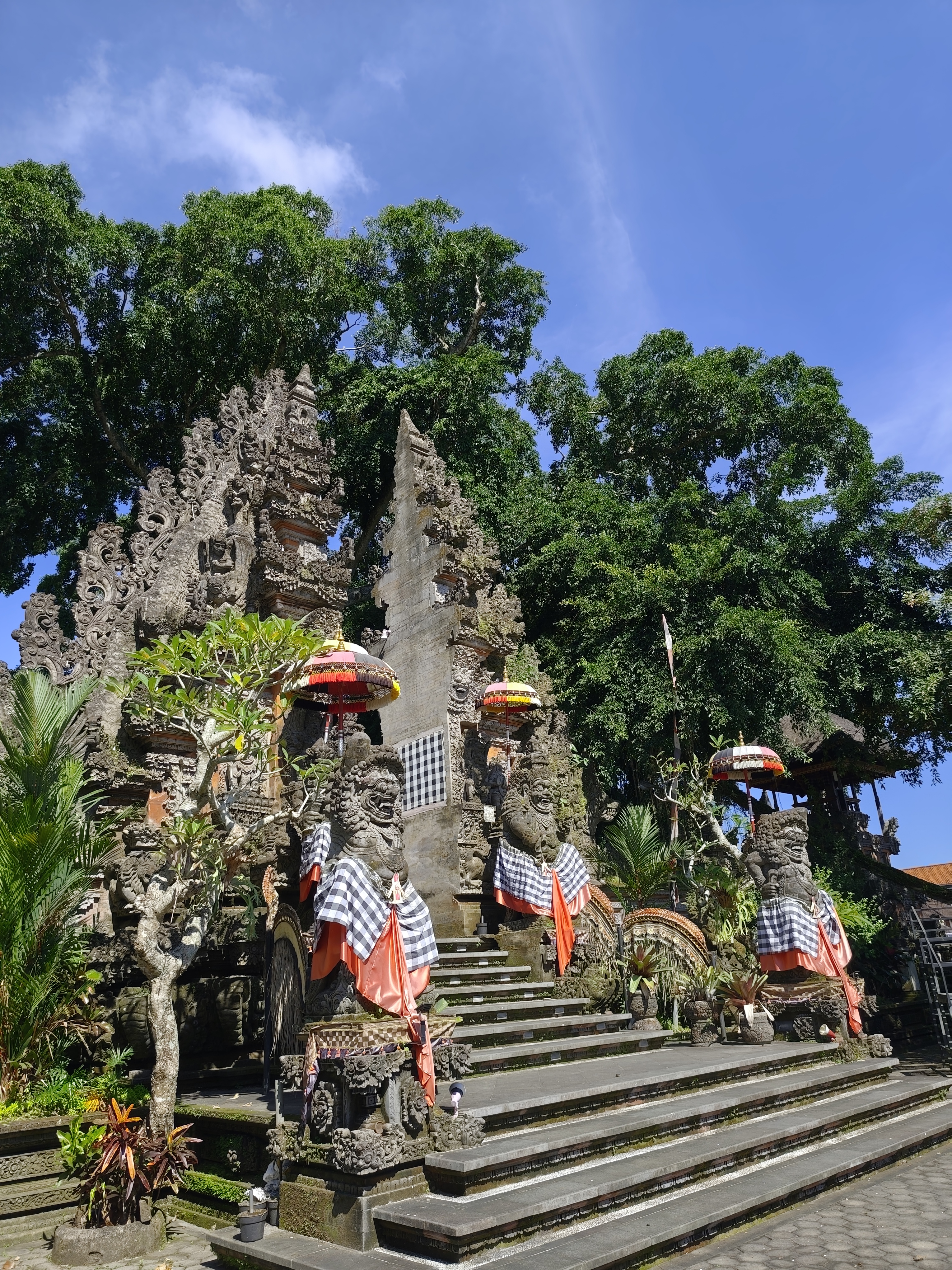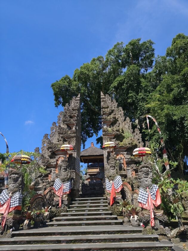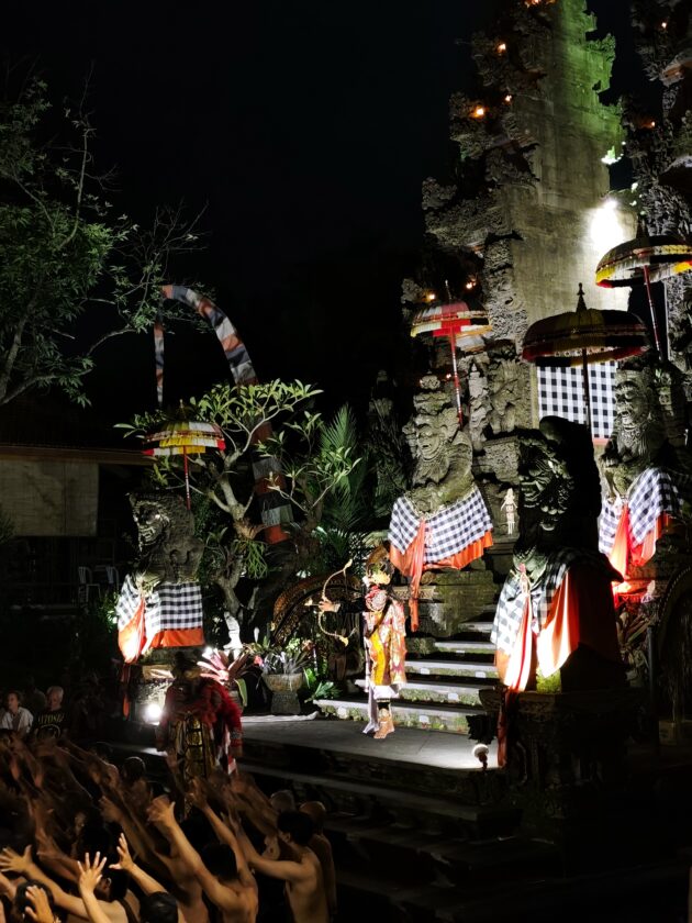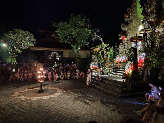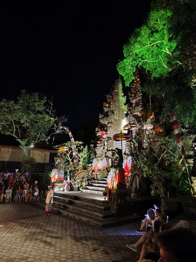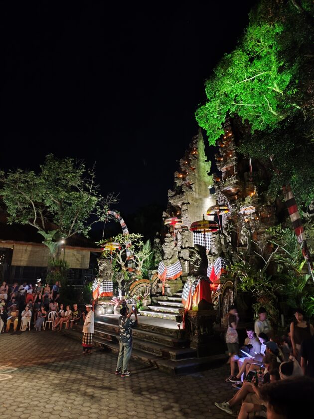 Am aterizat in Bali dupa-amiaza, ajungand seara la cazare si am hotarat sa incepem excursia cu o zi de relaxare in Ubud, unde eram cazati. Astfel, dupa ce am inceput ziua cu o cafea la Lazy Cats Caffe si am profitat de piscinele cazarii, ne-am indreptat agale catre Pura Dalem, cel mai apropiat templu de noi, pe care l-am vizitat pe timp de zi si am cumparat bilete la spectacolul de seara. Asa cum v-am mai povestit si cu alte ocazii, in cadrul templelor au loc si spectacole saptamanale, cum ar fi Barong dance, Legong dance sau Kekack fire dance, dansuri traditional Balineze care simbolizeaza de obicei lupta dintre bine si rau.