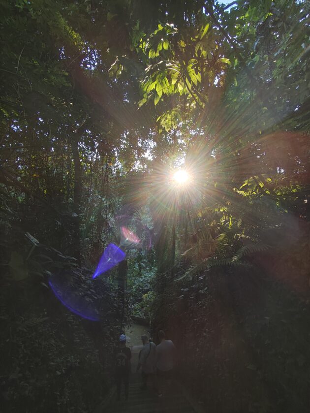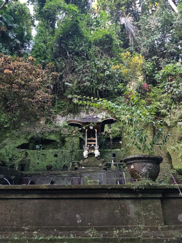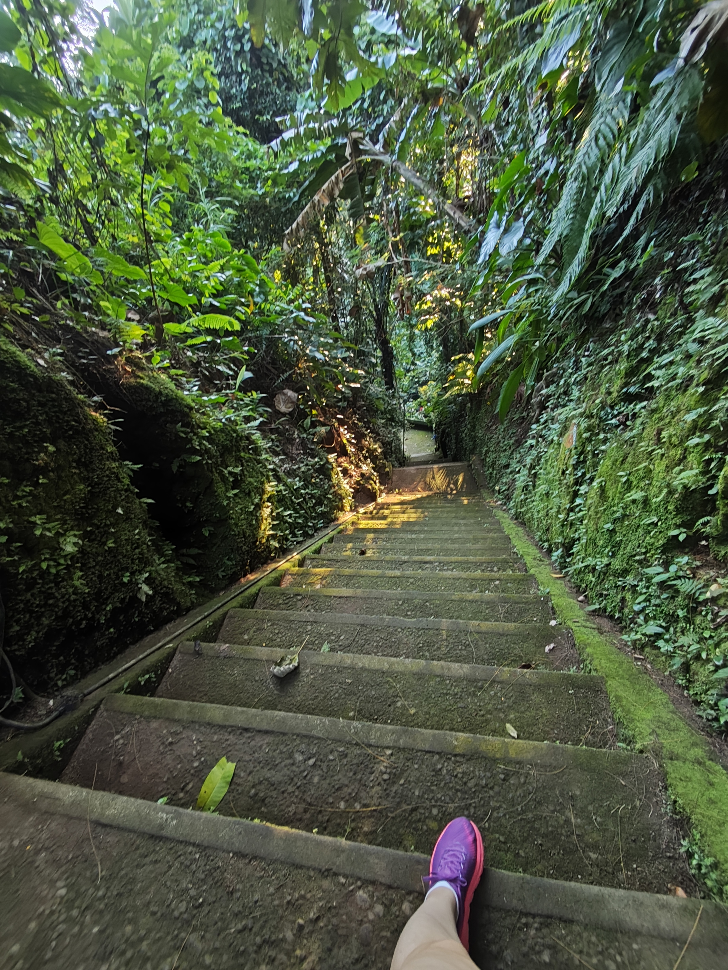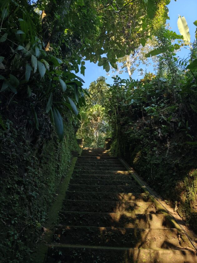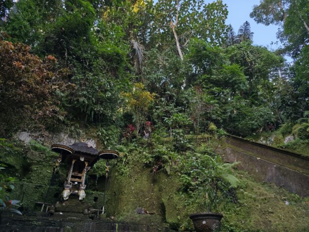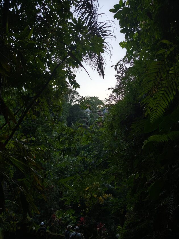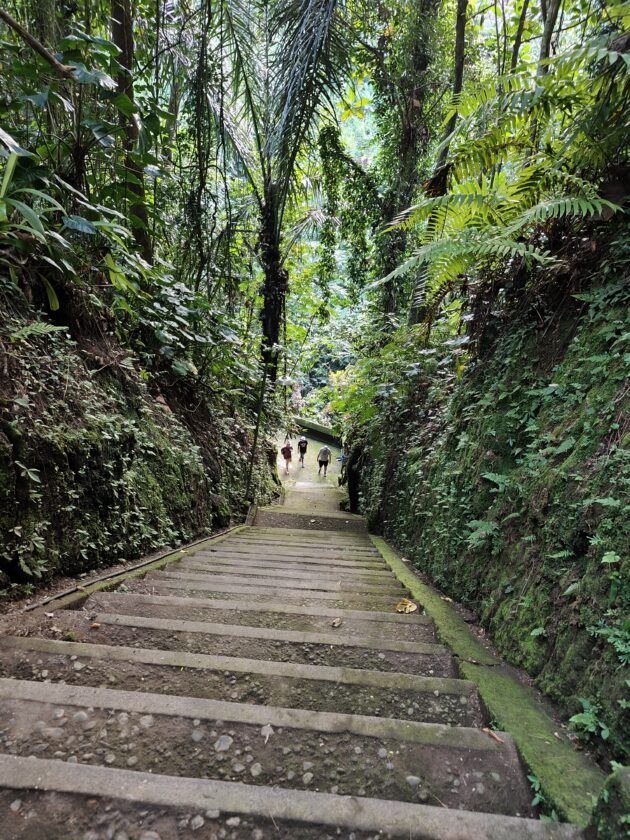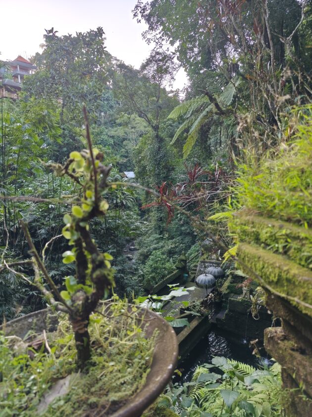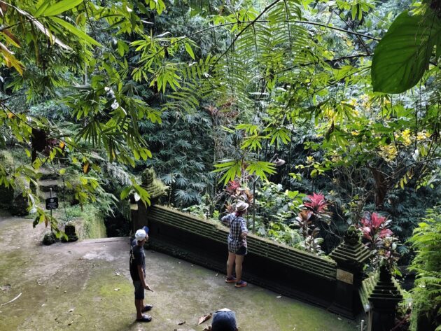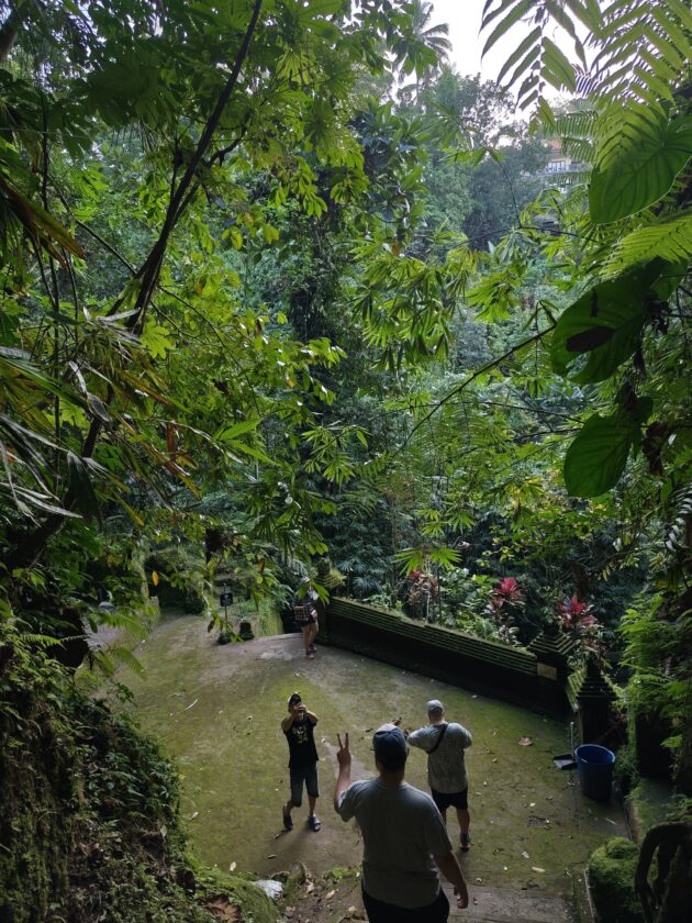 Am avut parte de peisaje superbe, dar si de ceva activitate fizica, coborarea catre templu realizandu-se pe o serie de trepte abrupte. Am vazut pasari de toate felurile, dar si maimute care se jucau in copac si care uneori se apropie chiar de curtile oamenilor. De altfel, orataniile locale, cum ar fi gainile, dorm in copac, deoarece, la fel cum la noi la Predeal primim vizite de la urs, in Bali te mai viziteaza din cand in cand varanul.