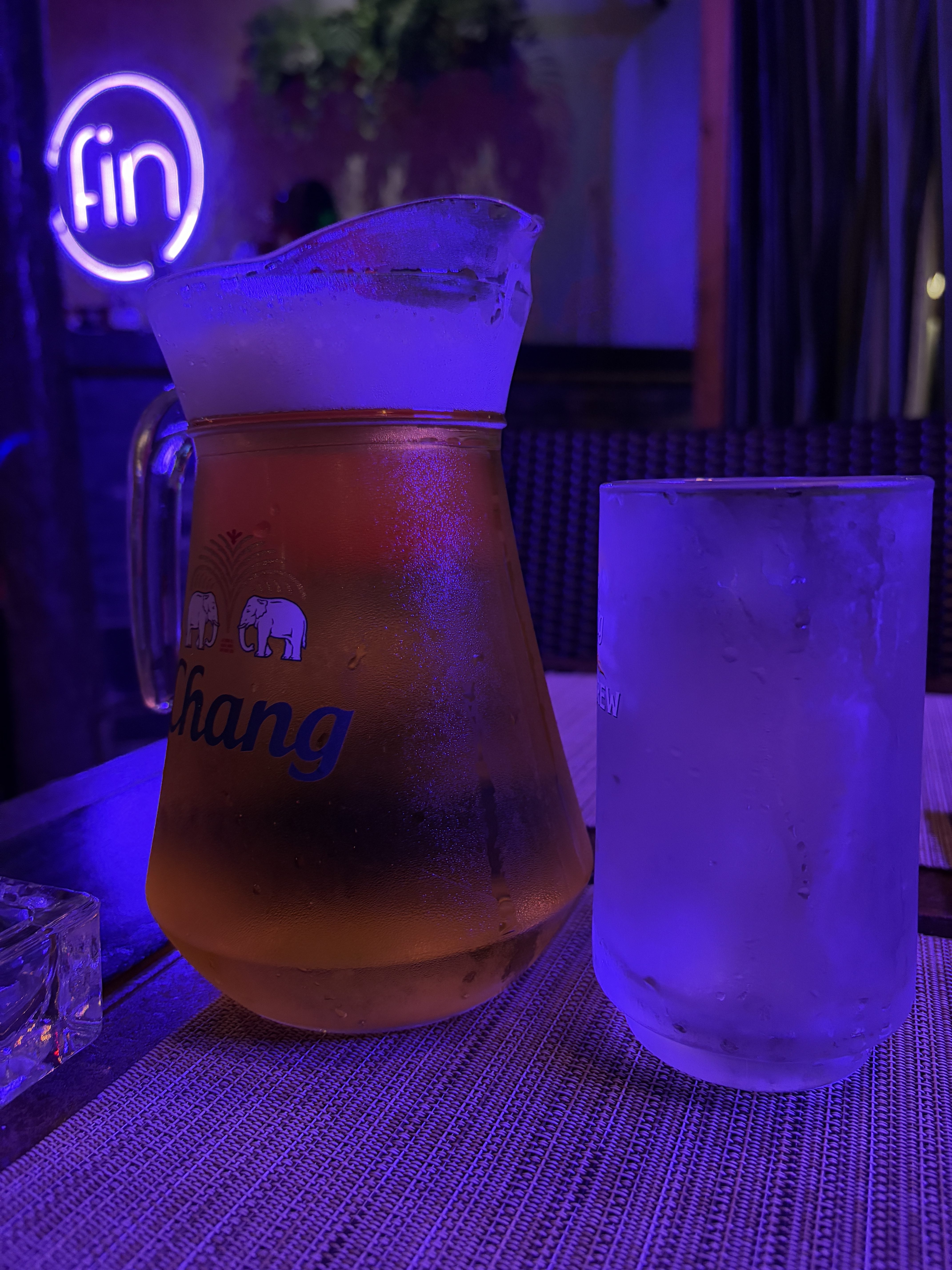 Dupa masa, parca ar mai merge o plimbare, nu-i asa? Sau o bere! Ceea ce am si facut de altfel in fiecare seara, plimbandu-ne de-a lungul strazii principale, printre vanzatorii de suveniruri, ajungand invariabil intr-unul dintre cele doua locuri cu muzica live de pe insula, mai precis Fin Koh Chang, cu atmosfera moderna si o formatie tanara, respectiv Giftsy Cocktail and Live Music Bar, unde formatia avea un repertoriu alcatuit in general din melodii din anii 70-80.