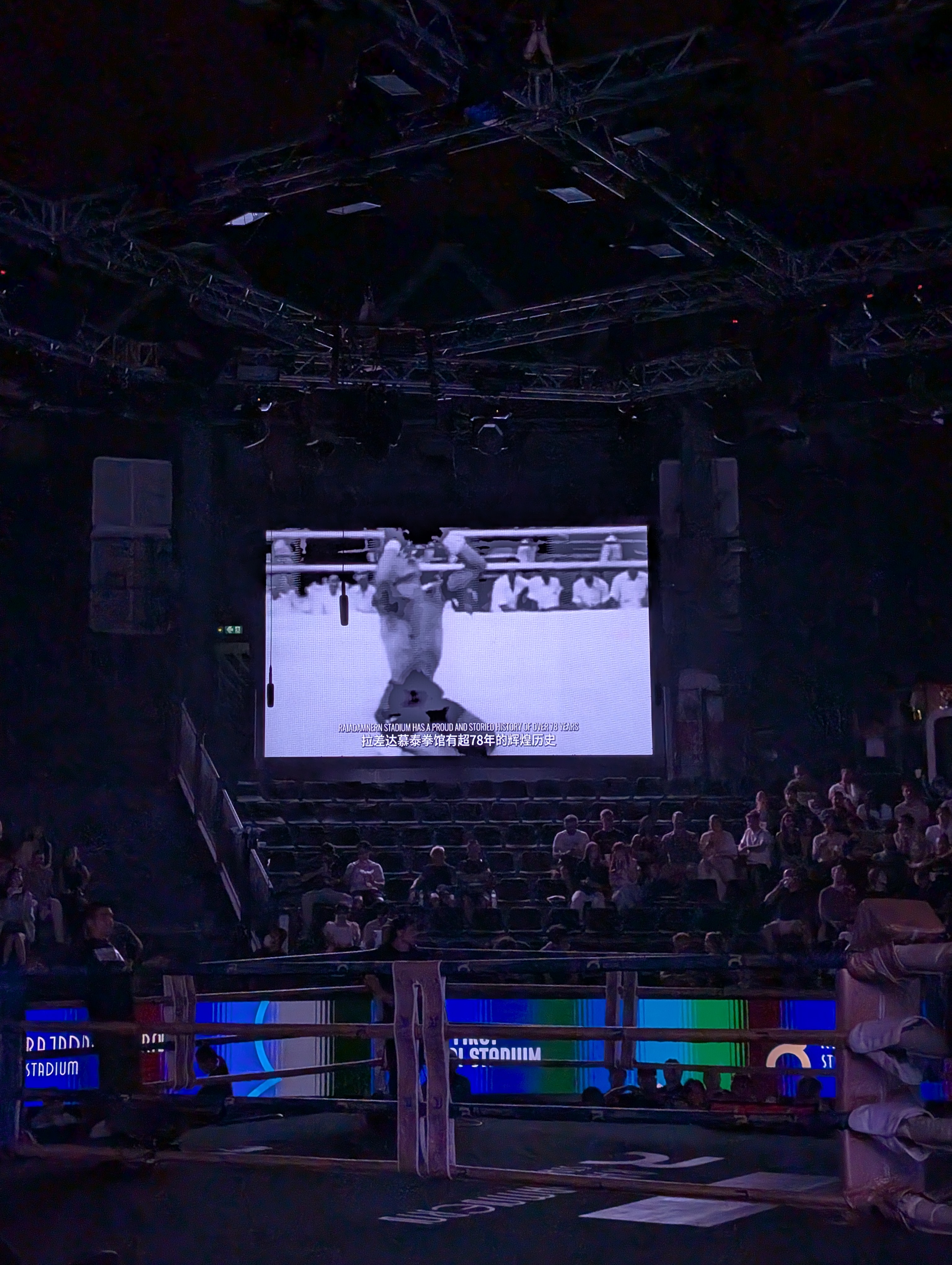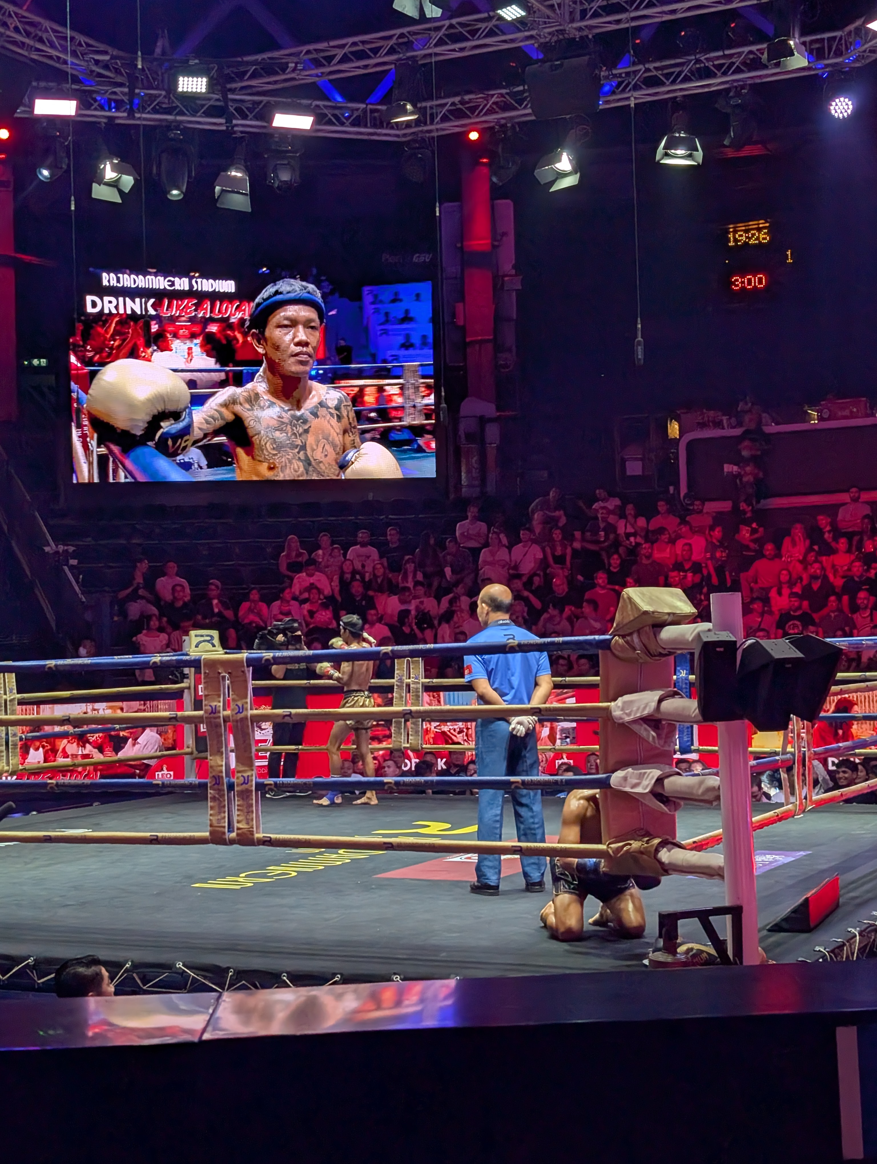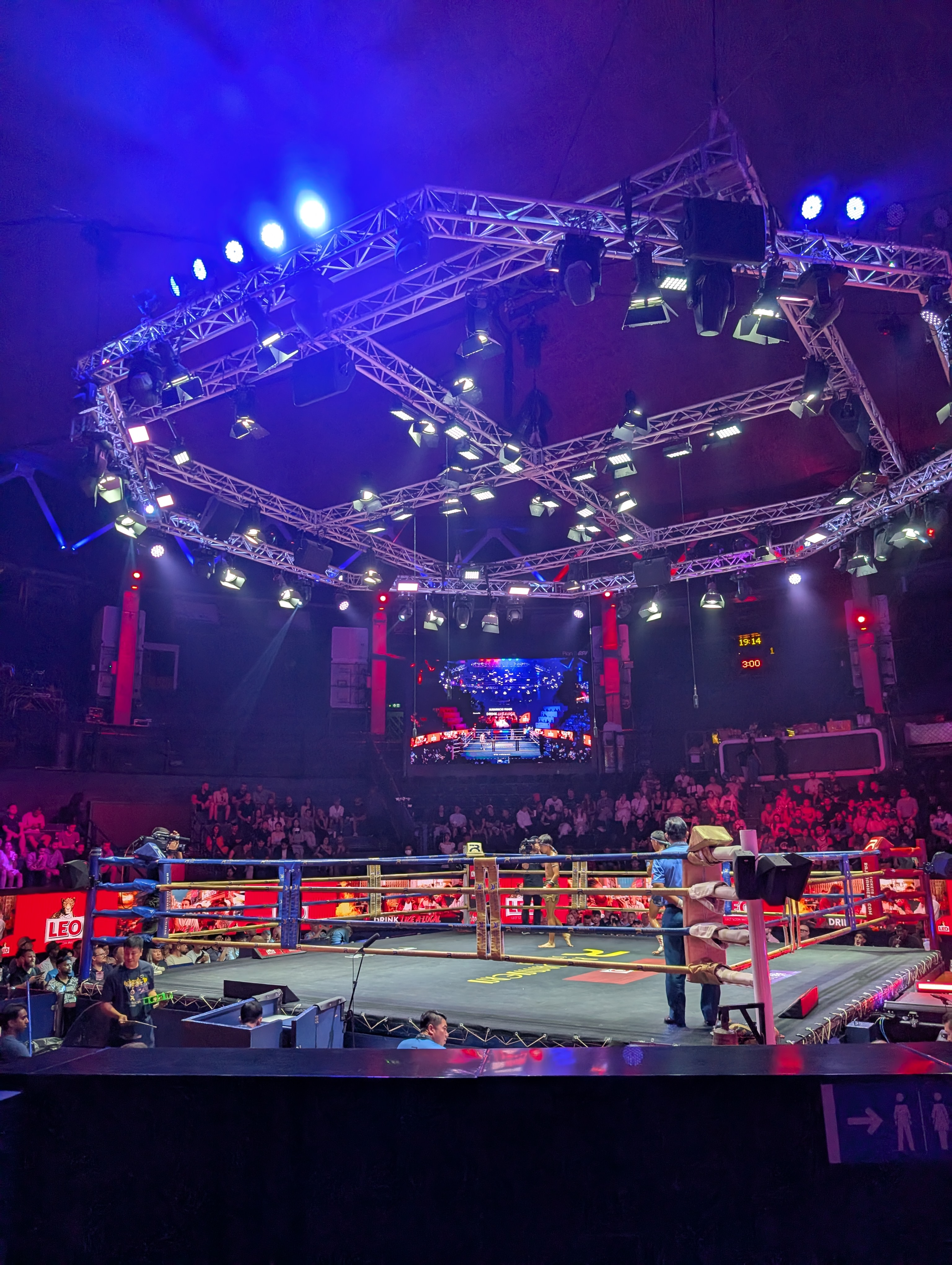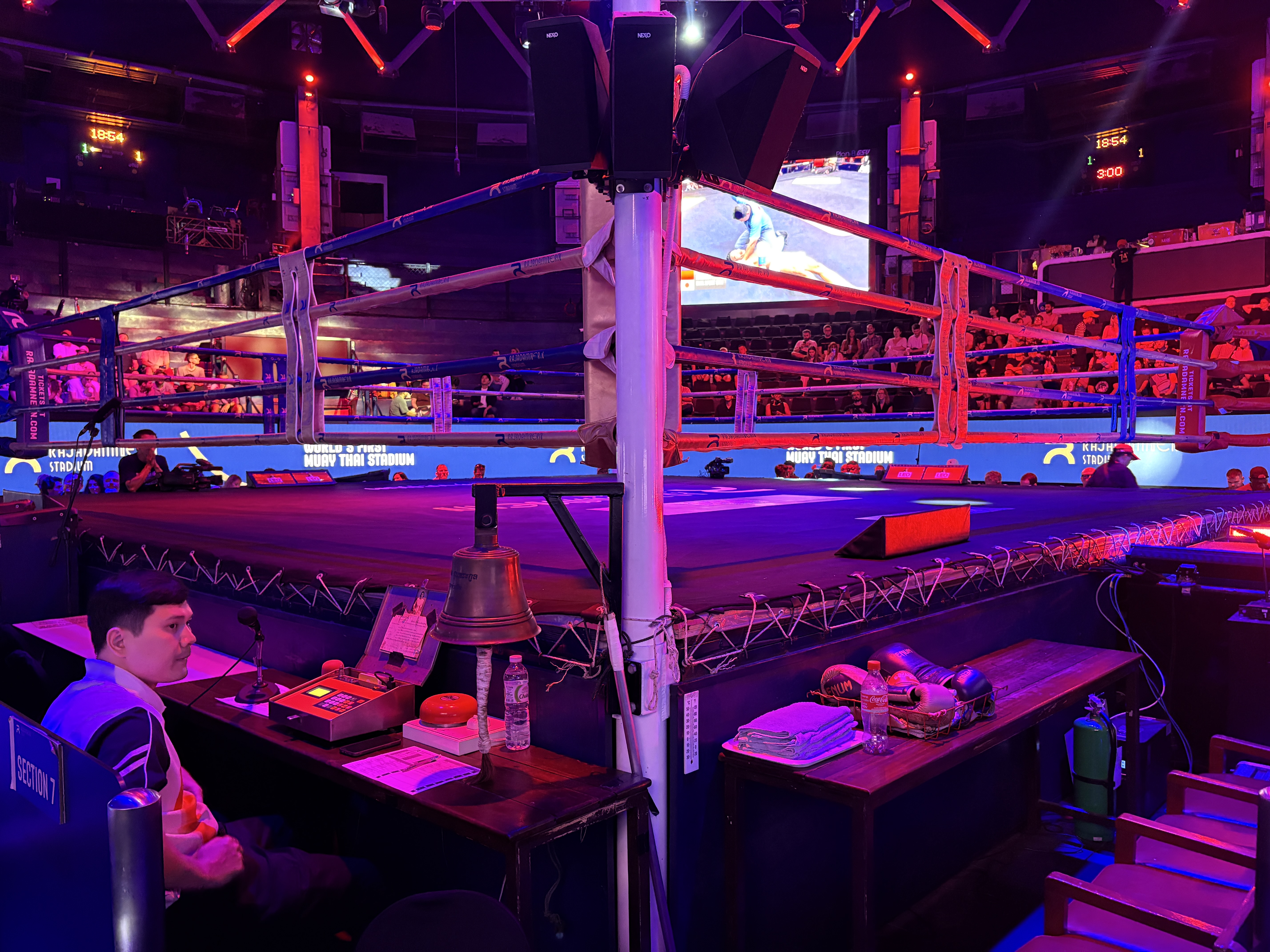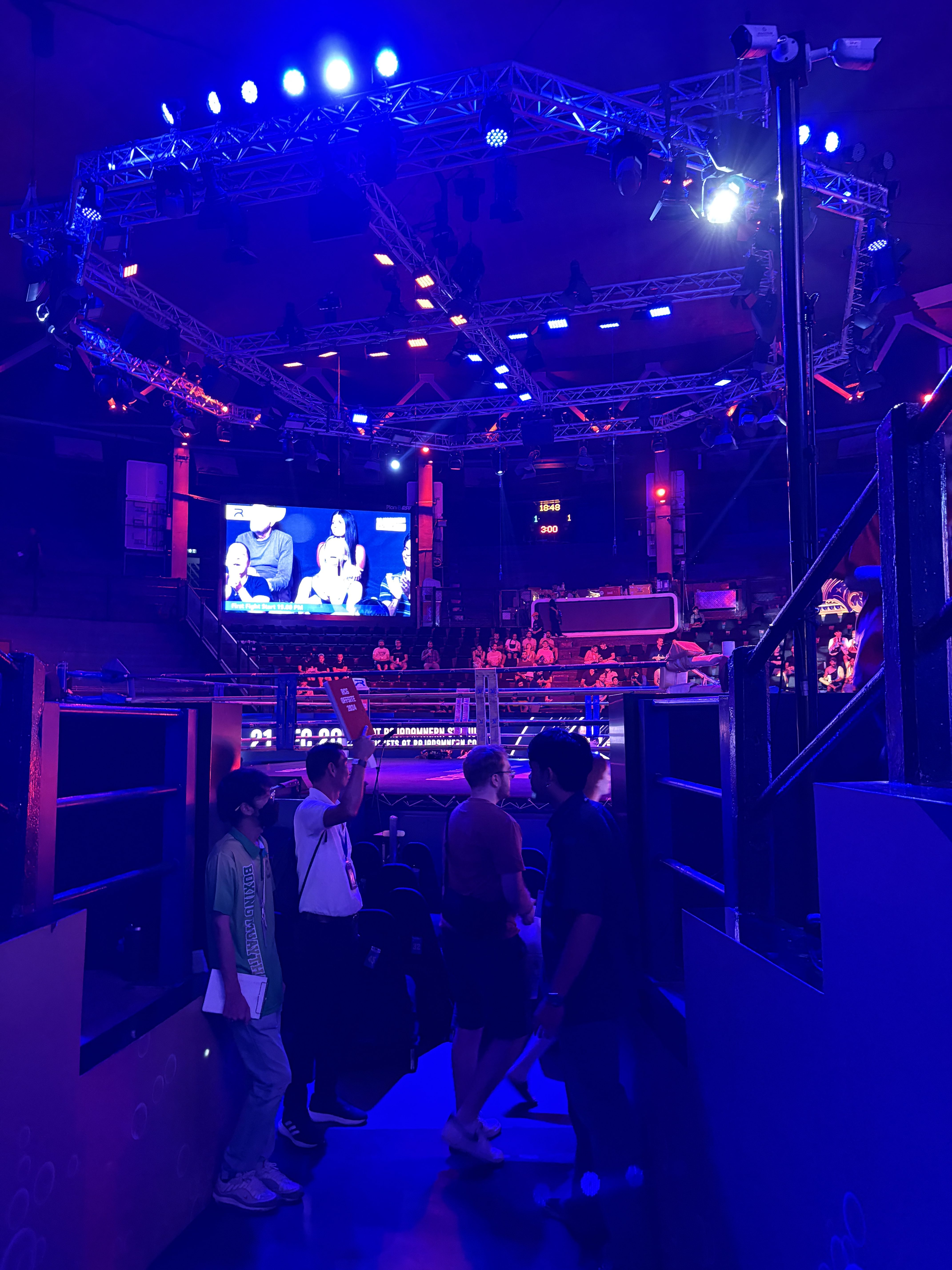 Stadionul gazduieste meciuri in fiecare seara, insa cele mai spectaculoase au loc sfarsitul saptamanii, drept urmare noi am ales sa mergem la gala de Vineri seara, in care s-au desfasurat 7 meciuri a cate 3 runde, in diferite categorii de greutate. Si va pot spune ca organizarea este impresionanta, stadionul oferind facilitati moderne (poti comanda mancare si bautura fara sa parasesti locul pe care stai), care se imbina de minune cu aspectul traditional al luptelor muay thai.