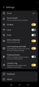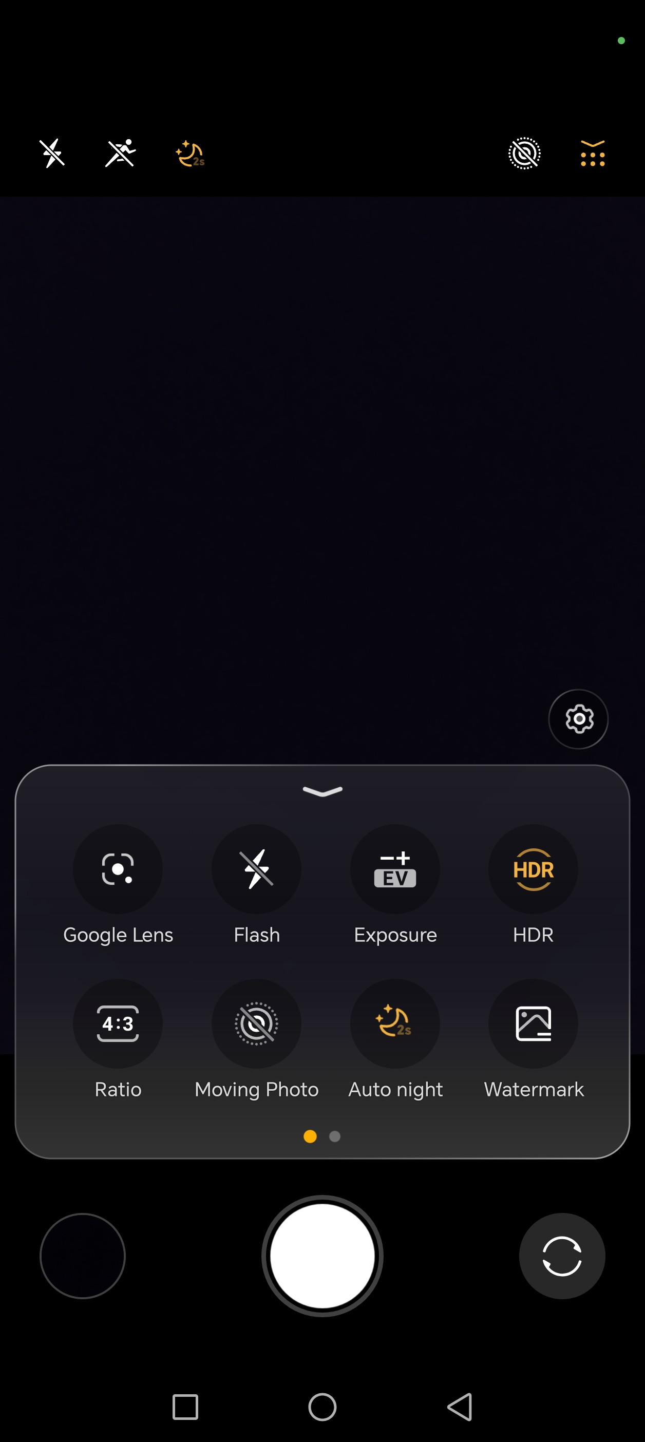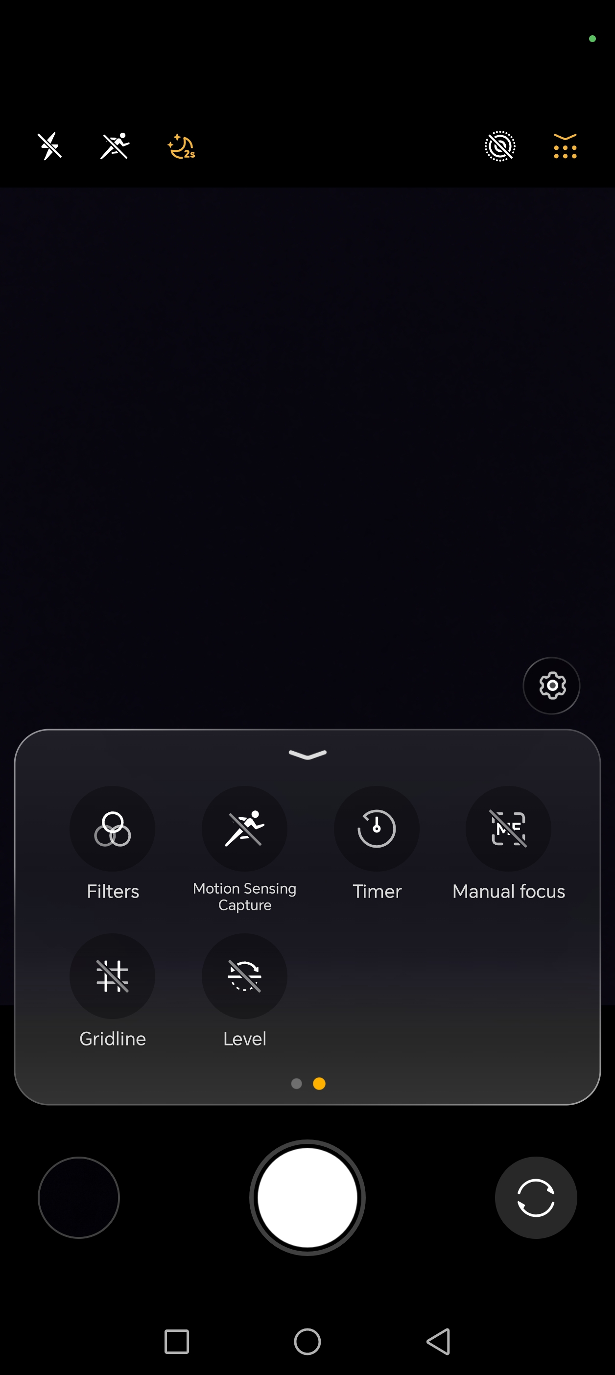 Cu un swipe de jos in sus deschidem meniul intermediar, in care avem acces rapid la flash, HDR, aspect, filtre, Motion Sensing Capture si alte setari de care s-ar putea sa avem nevoie rapid, fara a intra efectiv in meniul de setari, dispus in coltul din dreapta sus al ecranului.