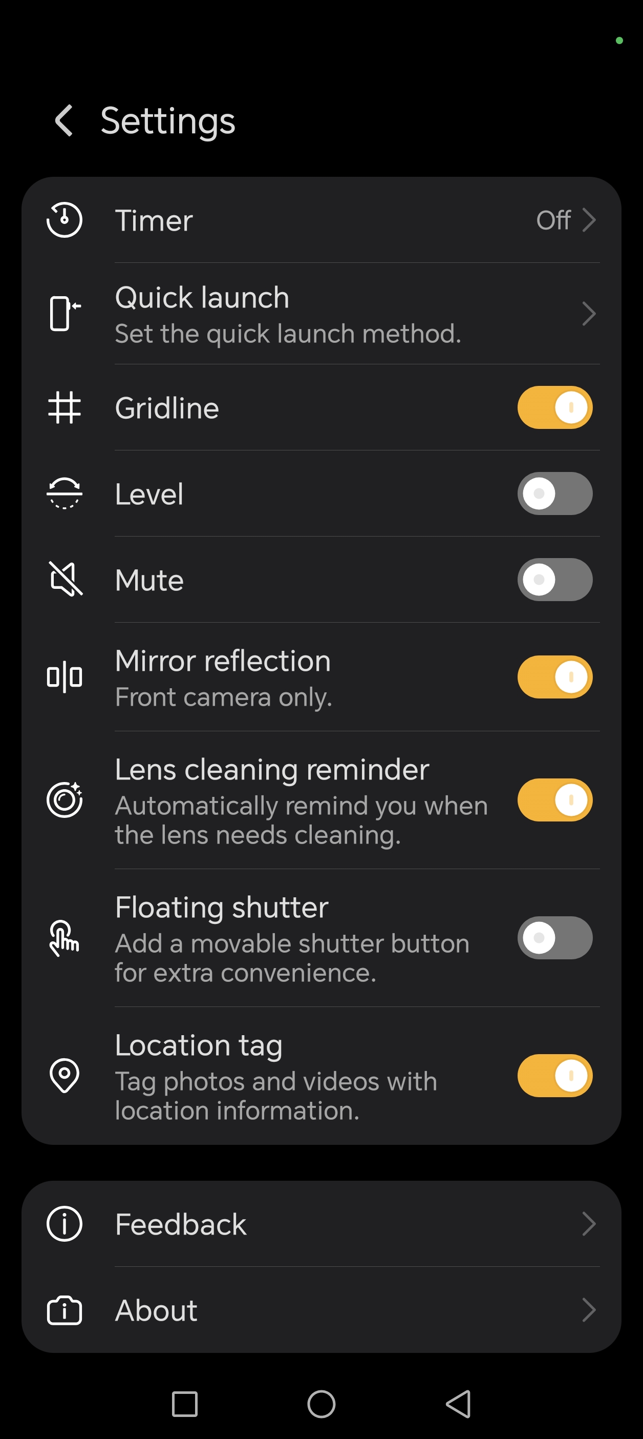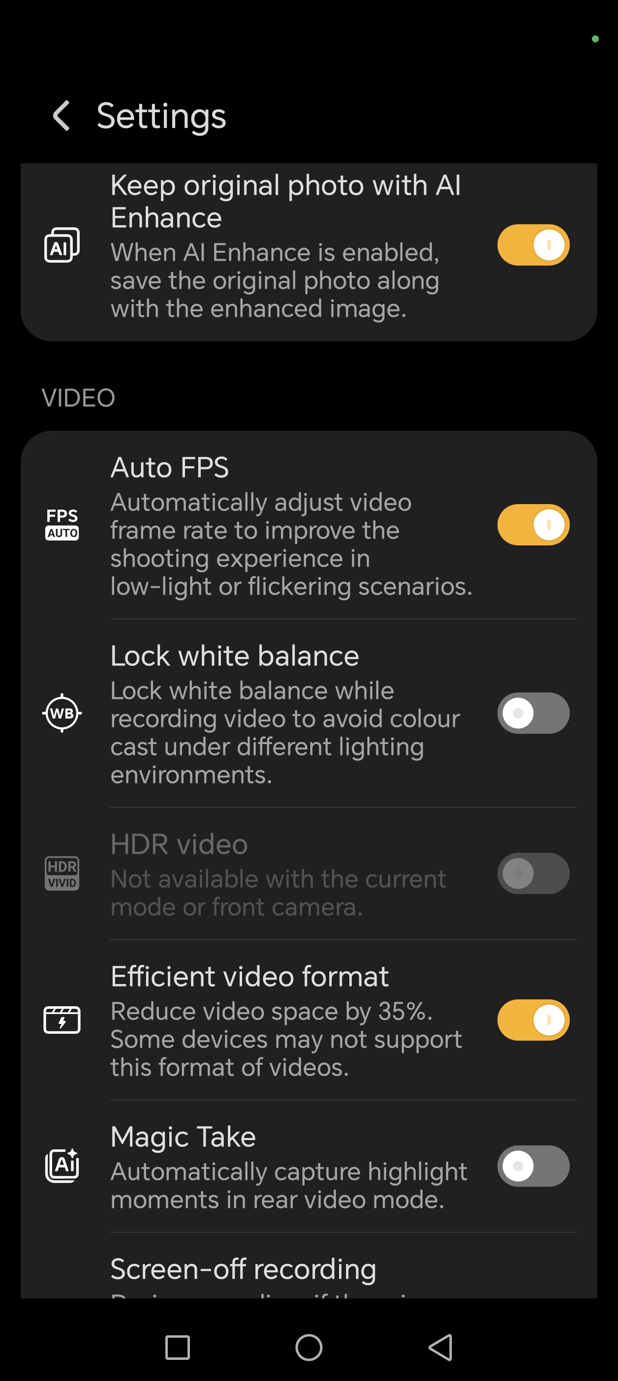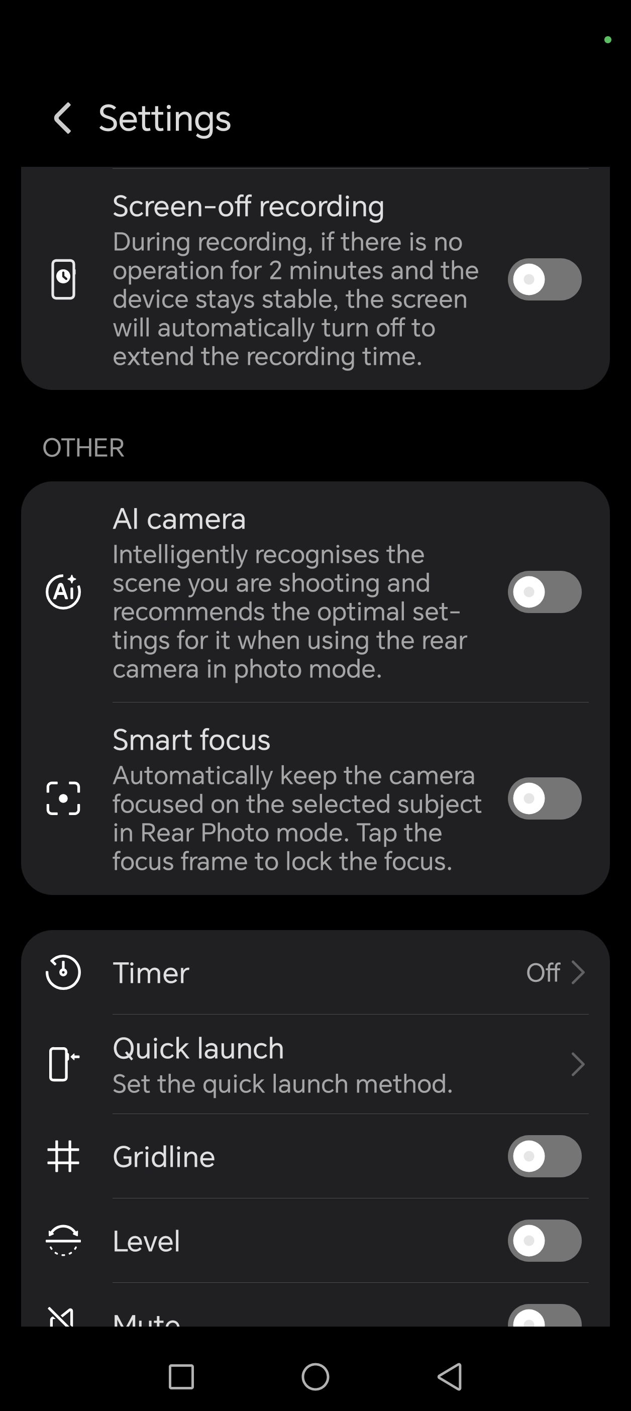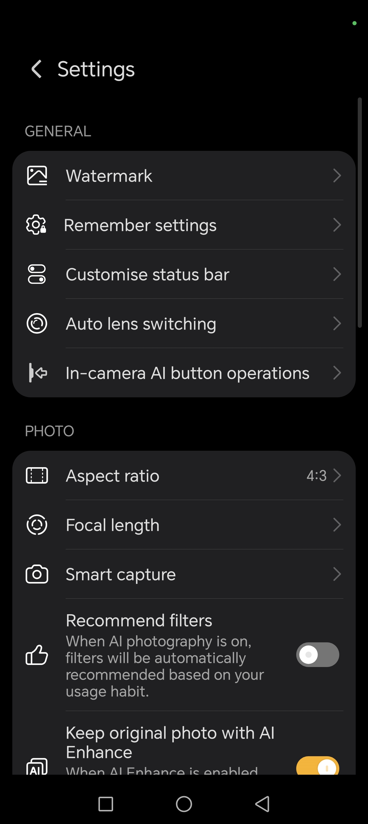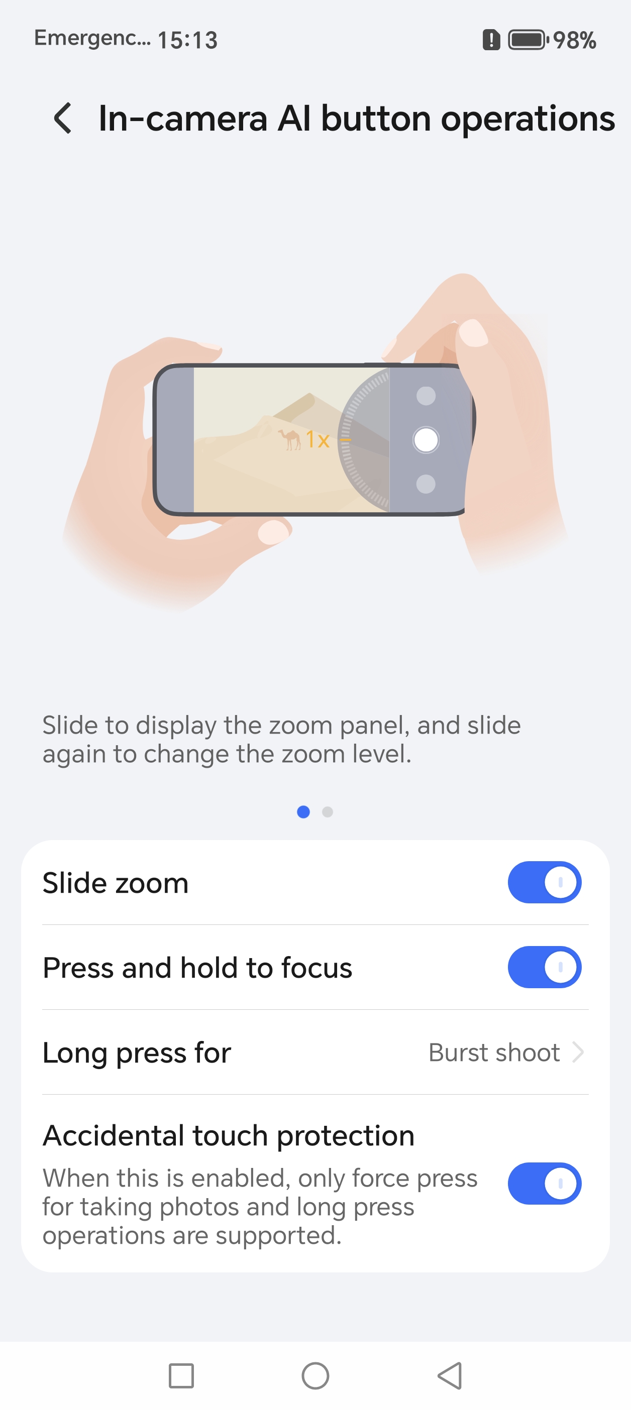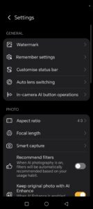 Daca intram totusi in meniu, vom gasi restul setarilor, inclusiv setarile pentru butonul AI, care are multiple functii in aplicatia Camera (slide pentru zoom, apasare pe jumatate pentru focus, declansare camera).