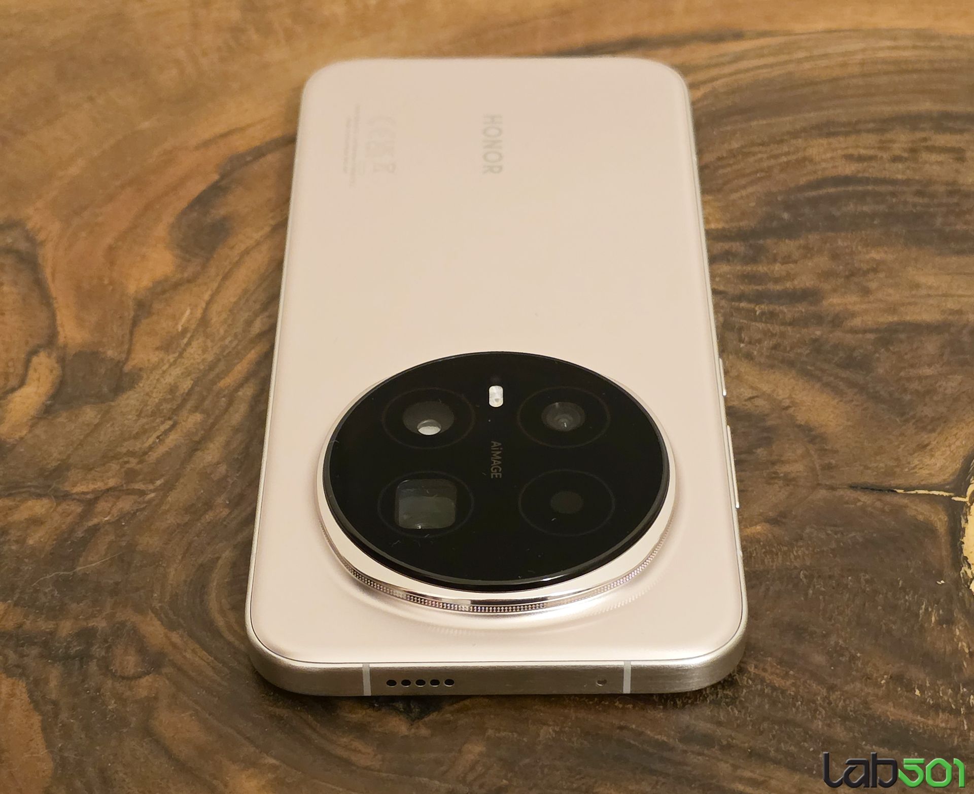 Astfel, sasiul de aluminiu este flancat elegant de un display protejat cu un strat de sticla HONOR NanoCrystal Shield, usor curbata inspre margini, spatele construit din sticla mata (frosted glass) fiind de asemenea usor curbat catre margini. Laturile din aluminiu mat complementeaza de minune telefonul subtire, insa nu ai cum sa nu simti greutatea indusa de insula masiva a camerelor.