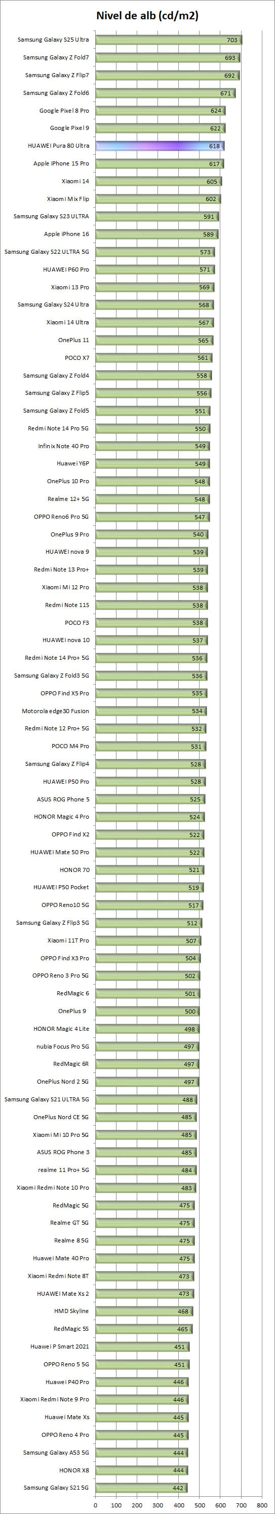HUAWEI Pura 80 Ultra este echipat cu un display Dynamic LTPO OLED cu o diagonala de 6.8″ si suport 120Hz / HDR Vivid (HDR 10), rezultatele obtinute in testele noastre fiind pe masura asteptarilor, cu un nivel maxim de alb de 618 cd/m2. Desigur, noi am masurat luminozitatea maxima in mod manual, nivelul acesteia crescand considerabil in soare, in mod auto, asa cum este de altfel cazul majoritatii varfurilor de gama disponibile in comert in momentul de fata.