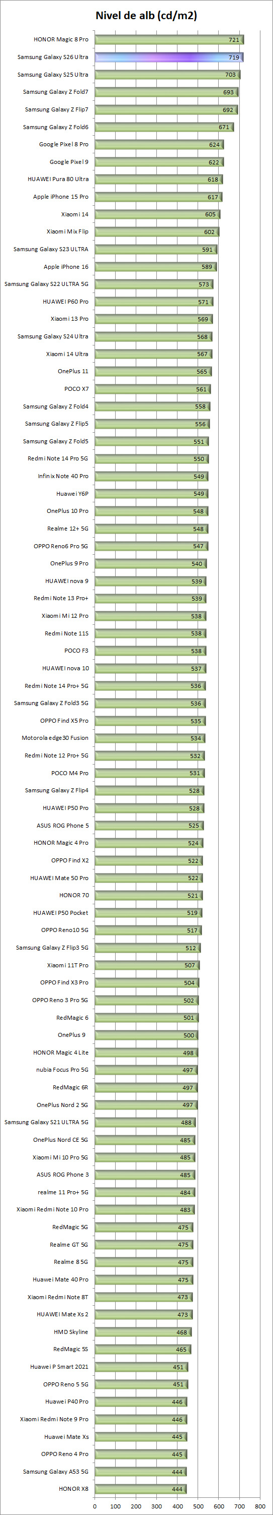 Panoul Dynamic AMOLED 2X este putin mai mare decat in cazul generatiei anterioare, avand o diagonala de 6.9″ si rezolutie 1440 x 3120 pixeli, iar rezultatele in teste sunt impresionante, colorimetrul nostru indicand un nivel maxim de alb de 719 cd/m2. Desigur, noi am masurat luminozitatea maxima in mod manual, nivelul acesteia crescand considerabil in soare, in mod auto, asa cum este de altfel cazul majoritatii varfurilor de gama disponibile in comert in momentul de fata.