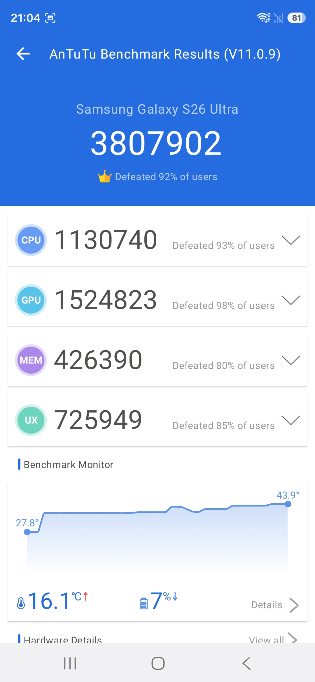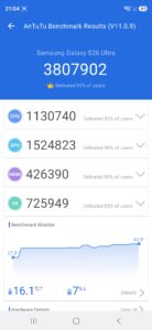 Acest lucru este evident inca de la primele teste, Samsung Galaxy S26 Ultra depasind toate smartphone-urile testate de noi pana acum in majoritatea benchmark-urilor. Chiar si asa, discutam despre cel mai puternic chipset de pe piata, integrat intr-un smartphone destul de subtire, drept urmare chipset-ul intra in throttle dupa aproximativ 5 minute de utilizare la capacitate maxima, performanta scazand cu aproximativ 30%, adica un comportament similar cu ceea ce vedem in cazul altor flagship-uri.
